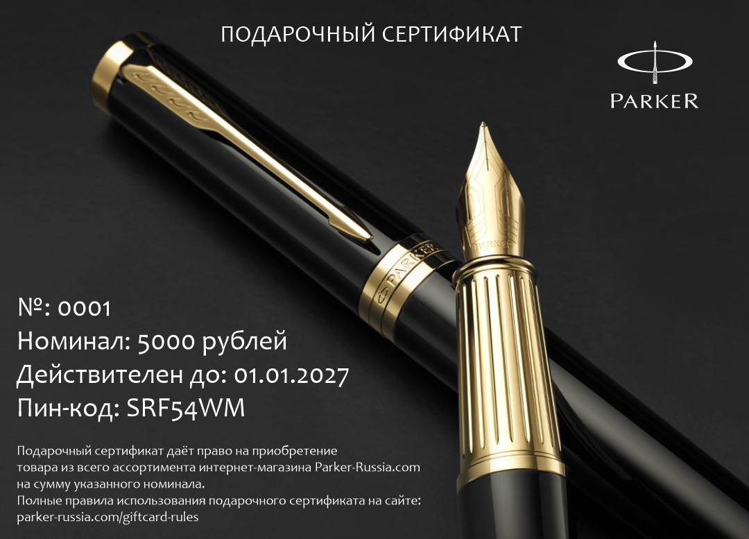 Электронный сертификат гибкого номинала от официального дилера Parker во Владикавказе. Вы можете дополнительно заказать гравировку, которая подчеркнет Вашу оригинальность и придаст памятность статусному подарку. Все ручки Паркер поставляются в фирменном футляре.